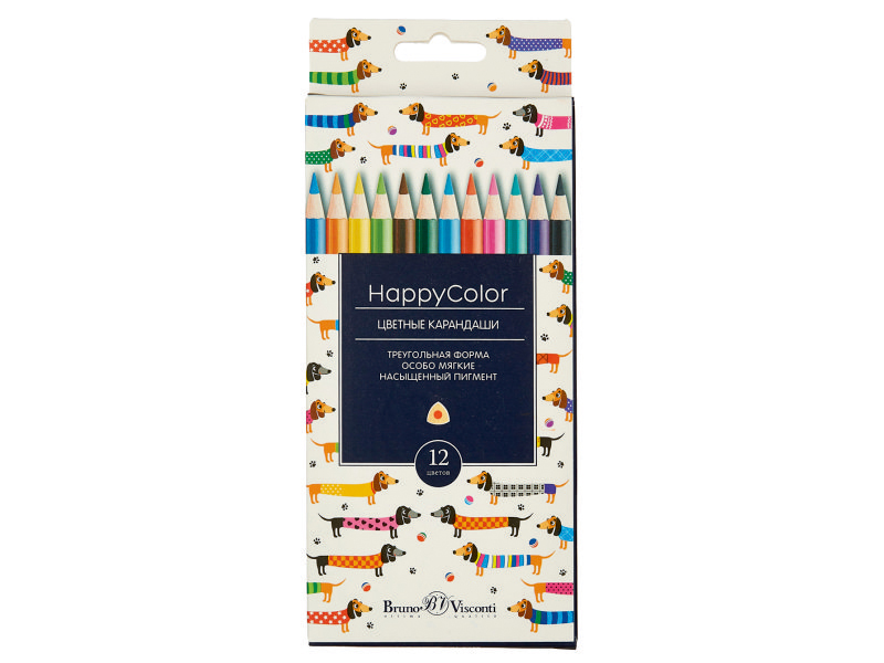 Карандаши в наборе цветные - 12цв., «HAPPYCOLOR»  от торговой марки Bruno Visconti.  Рисовать ими легко и в удовольствие.  Карандаши мягко скользят по поверхности бумаги, не царапая ее, оставляя яркий и насыщенный след. Таким свойством карандаши обладают благодаря высококачественным и безопасным цветным пигментам в составе грифеля.