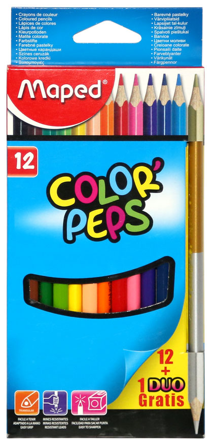 В наборе "COLOR'PEPS" двенадцать ярких, насыщенных цветов. Палитра очень разнообразна - содержит различные оттенки цветов. Уникальность набора в том, что в него входит карандаш с двойным грифелем: с одной стороны - серебряный цвет, с другой - золотой. Вашему ребенку это обязательно понравится!