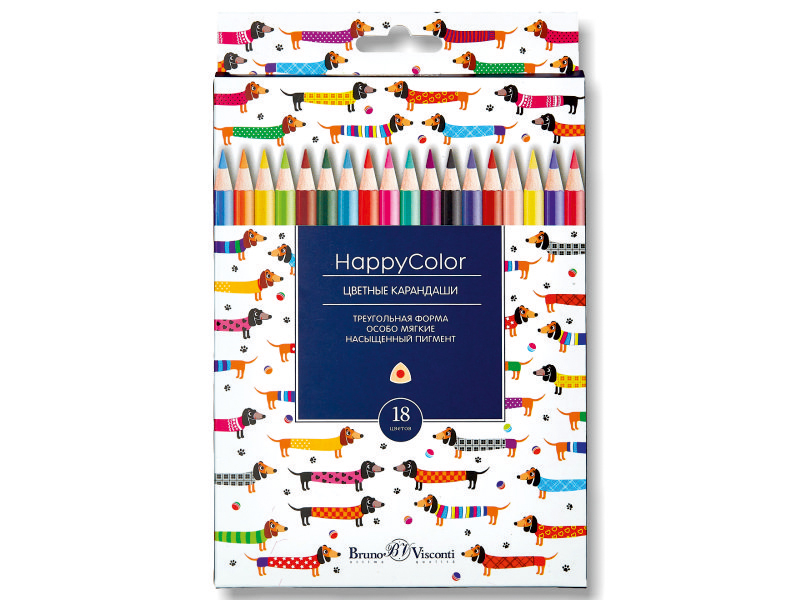 Карандаши в наборе цветные - 18цв. «HAPPYCOLOR»  от торговой марки Bruno Visconti. Рисовать  легко и в удовольствие. Карандаши мягко скользят по поверхности бумаги, не царапая ее, оставляя яркий и насыщенный след. Таким свойством карандаши обладают благодаря высококачественным и безопасным цветным пигментам в составе грифеля.