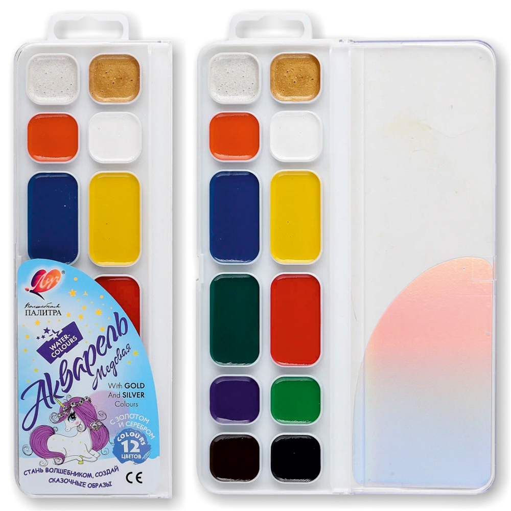 Акварель помещена в пластмассовую упаковку с прозрачной крышкой, без кисти, с подвесом. Срок годности не ограничен. В наборе 12 цветов.