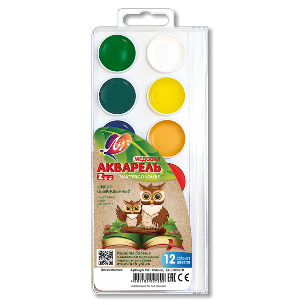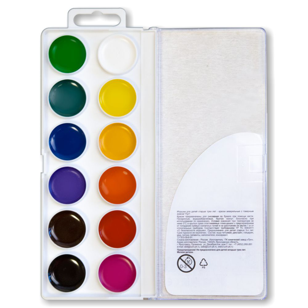 В наборе красок акварельных двенадцать ярких, насыщенных цветов. Кисть в комплектацию красок акварельных не входит, что дает Вам прекрасную возможность подобрать такой аксессуар, который будет удобен для ребенка (с учетом его возраста, какой рукой пишет - левша или правша). Можно с легкостью сочетать и смешивать цвета этих акварельных красок - при этом не образуется грязных оттенков. Краски акварельные не выцветают со временем.