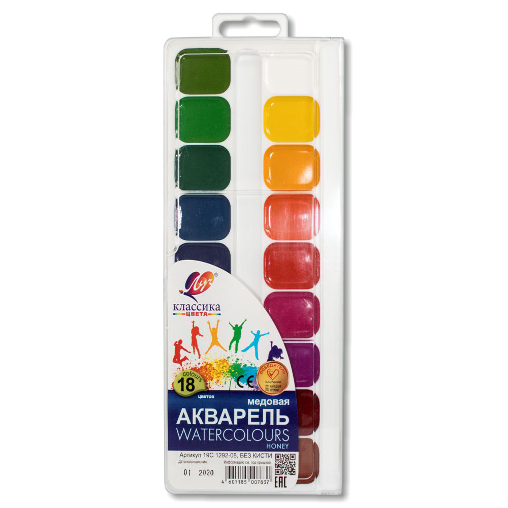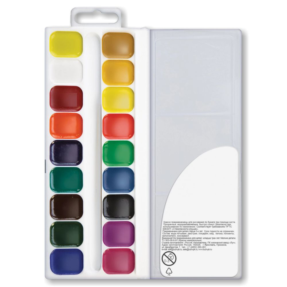 Краски акварельные выпускаются в пластиковой упаковке с прозрачной крышкой. Кисть не входит в комплектацию, что дает прекрасную возможность подобрать этот аксессуар самостоятельно. У нас представлен широкий ассортимент кистей - Вы можете выбрать любую.