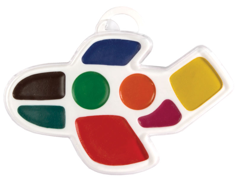 Краски акварельные "САМОЛЕТИК" находятся в пластмассовой фигурной упаковке с прозрачной крышкой, которая может послужить наглядным дидактическим материалом. Фигурную упаковку далее используют, как шаблон, для создания рисунков.