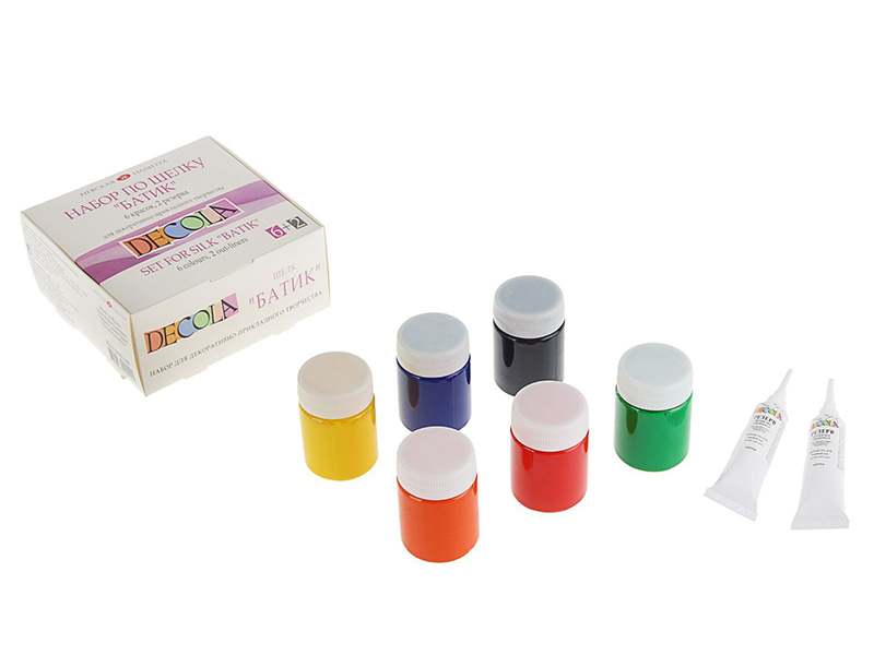 Акриловые краски по шелку в наборе "Батик-Decola" от бренда "Невская палитра" на основе водной акриловой дисперсии предназначены для росписи х/б и шелковых тканей методом холодного батика или свободной росписи. При росписи синтетических тканей рекомендуется убедиться в прочности закрепления рисунка на образце ткани в соответствии с инструкцией по применению. Ткань предварительно выстирайте, выгладите, натяните на раму или пяльцы. По методу холодного батика нанесите по контуру рисунка резерв по шелку смываемый для предотвращения смешивания красок. Просушите до полного высыхания (1-1,5 ч). Краску тщательно перемешайте и нанесите на изделие кистью, просушите 24 ч. При свободной росписи резерв не применяется. Готовое изделие прогладьте 5 мин через х/б ткань утюгом, нагретым до температуры для хлопка. Через 48 ч после проглаживания резерв удалите с шелка, постирав изделие мягкими моющими средствами при температуре от 30°С до 40°С без сильного механического воздействия. Храните краски в плотно закрытой таре. Кисти и инструменты сразу после работы промойте водой. При попадании на кожу смойте водой. В наборе: 6 цветов + 2 цв.х18 мл. в резерве.