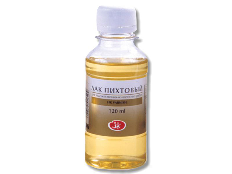 Лак пихтовый торговой марки "Невская Палитра", пленка лака имеет обратимый характер, после высыхания легко растворяется в растворителе. Время высыхания до 4 часов.