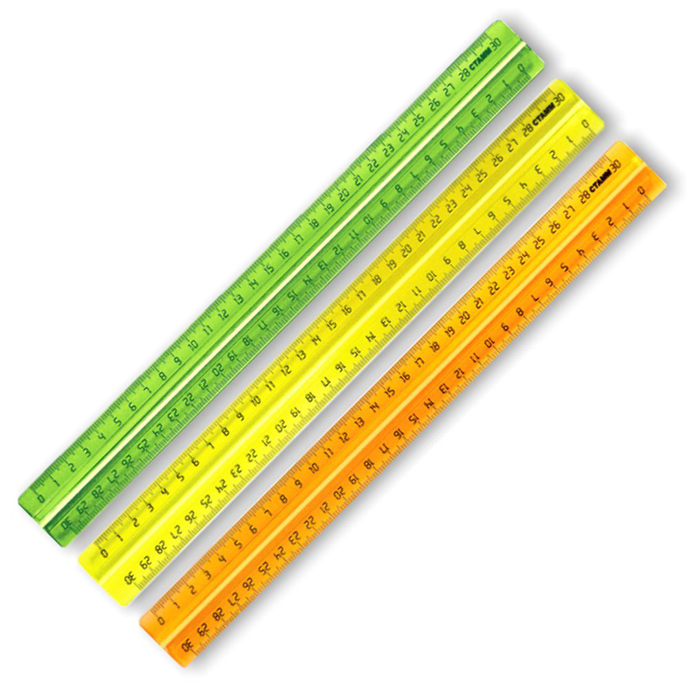 Линейка "NEON Cristal" от торговой марки "Стамм" с ровной чёткой миллиметровой шкалой. Длина - 30см. Предусмотрен удобный держатель по всей длине линейки. Прозрачная. Ассорти: 4 ярких неоновых цвета (зеленый, желтый, розовый, оранжевый). Безопасные закруглённые углы. Гладкая глянцевая поверхность.  Материал: cертифицированный полистирол.
