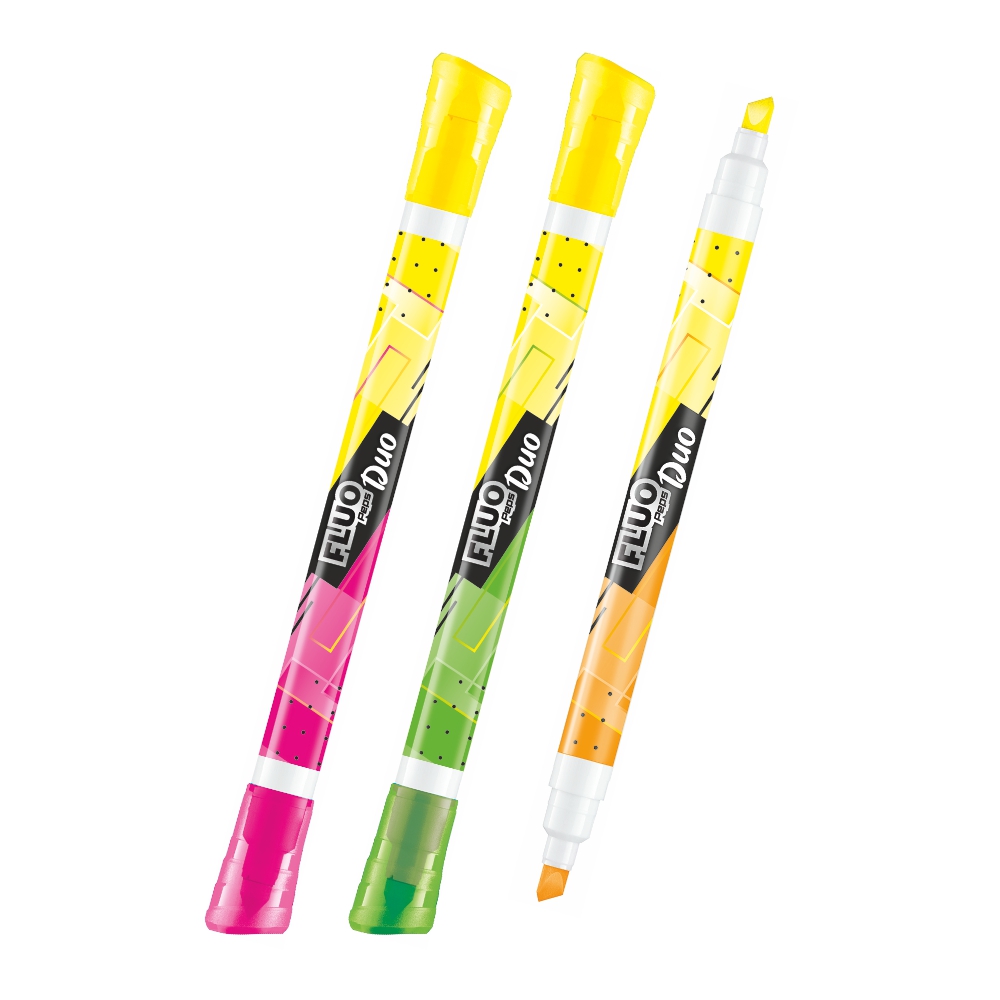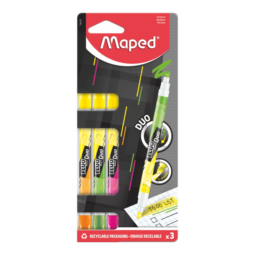 Перманентные маркеры «FLUO DUO» от бренда Maped в формате с двойным наконечником.