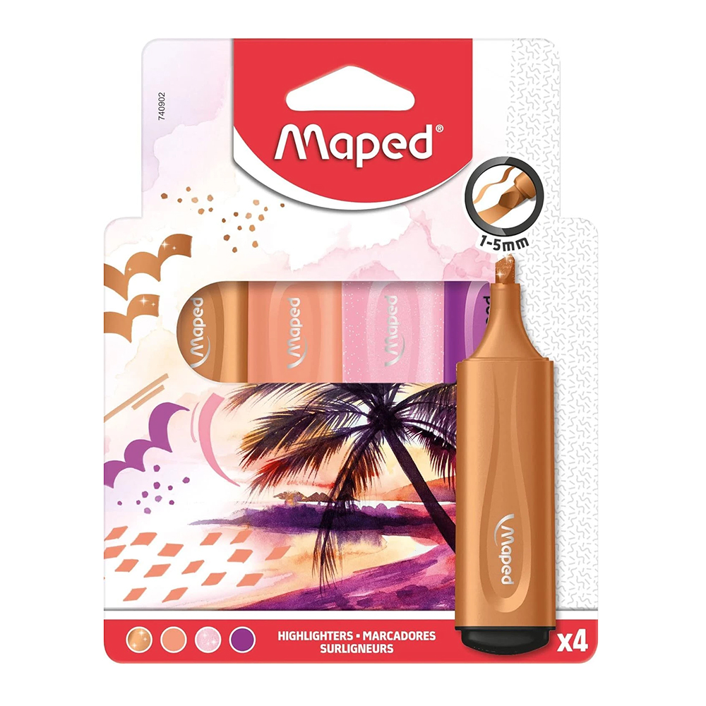 Яркий набор текстовых маркеров Maped "Ocean.Tropical.Sunset" включает 4 насыщенных цвета, вдохновлённых морской и тропической тематикой. Маркеры легко наносятся на бумагу, создавая ровные и яркие линии. Эргономичная форма корпуса обеспечивает комфортное письмо даже при длительной работе.