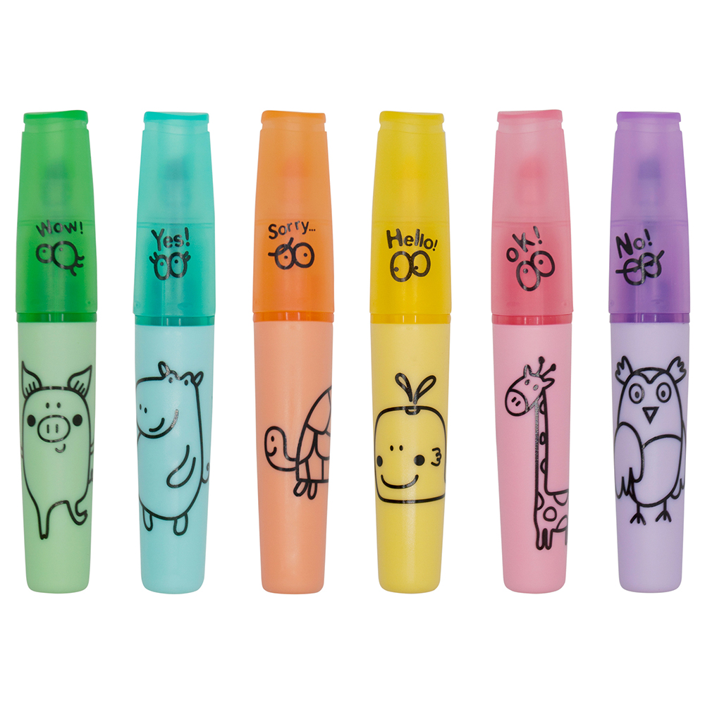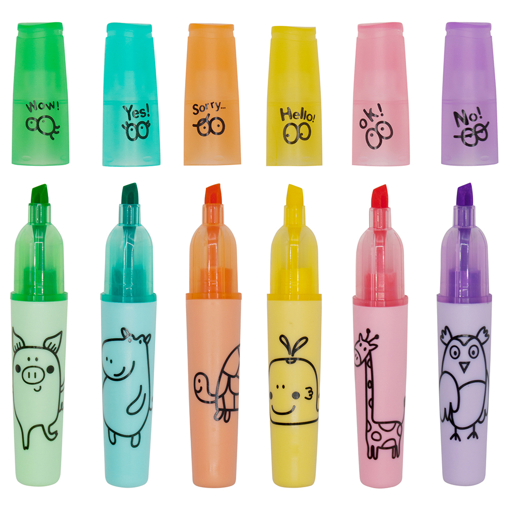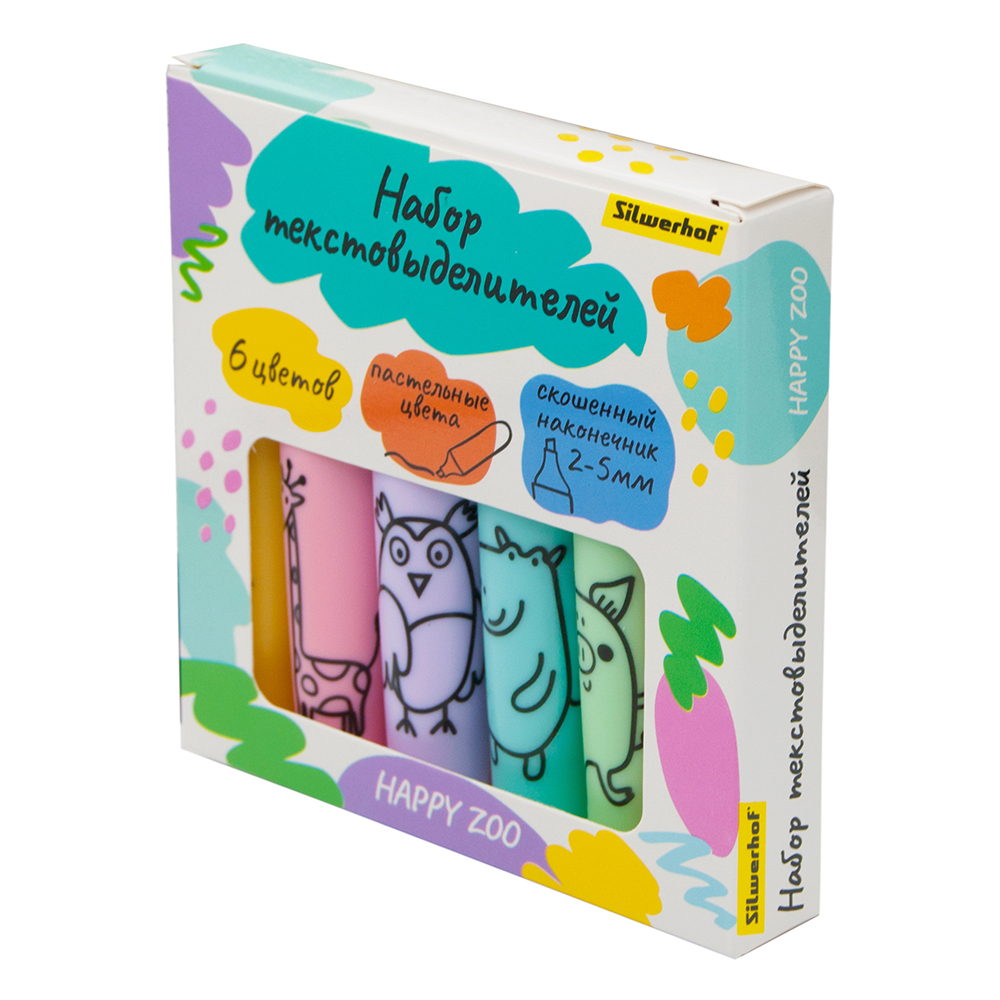 Маркеры текстовые "Happy Zoo"  в наборе для яркого выделения текста от бренда Silwerhof. В наборе 6 ярких пастельных цветов. Корпус украшен изображениями различных зверей и имеет удобную круглую форму, а цвет колпачка соответствует цвету чернил. Толщина линии 2-5 мм.