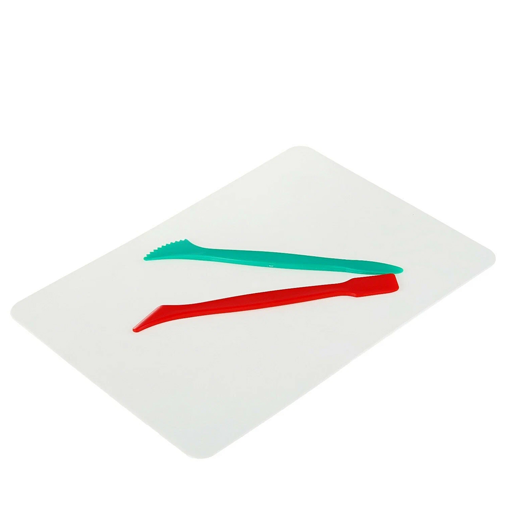 Доска имеет большую, безупречно гладкую рабочую поверхность. Изготовлена из сертифицированного полистирола. У модели закругленные углы, что гарантирует дополнительную безопасность при использовании. В качестве декора - яркий бумажный вкладыш. В комплектацию входит 2 стека, которые помогут в лепке мелких деталей.