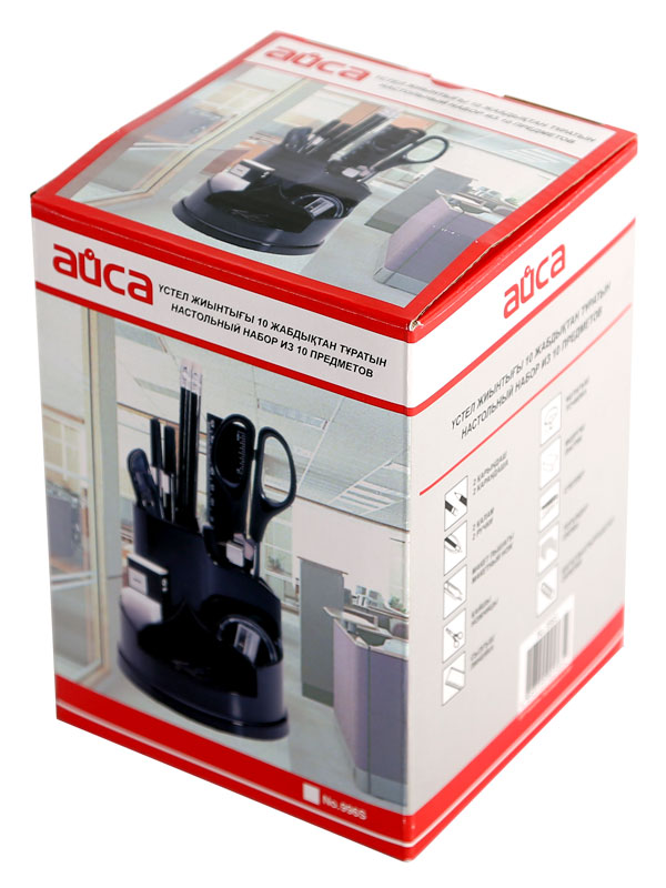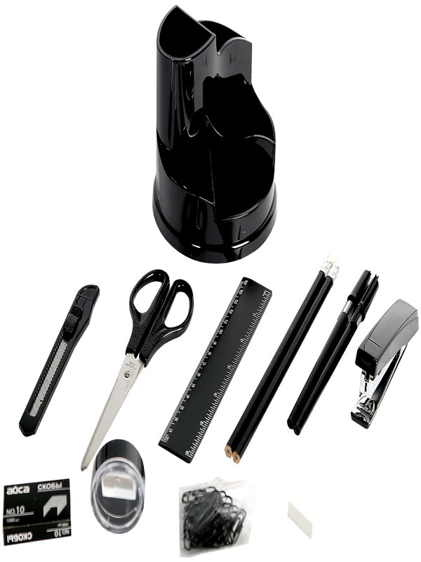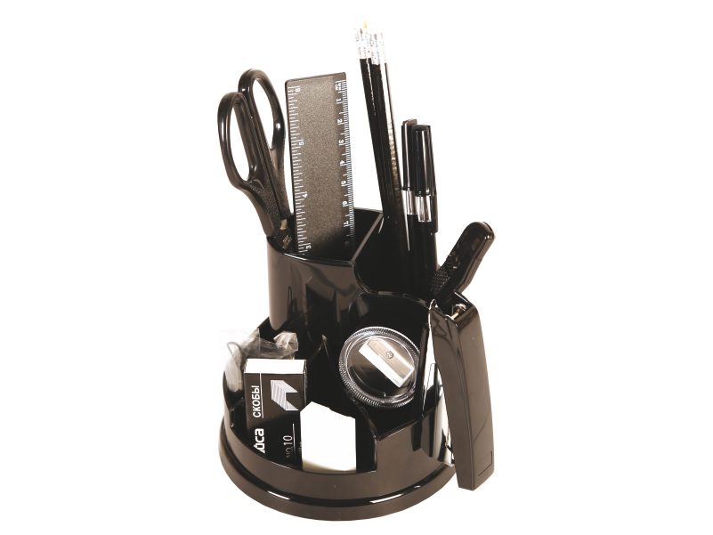 Настольный набор для канцелярских принадлежностей от казахстанского бренда "Айса". Товары"Айса" - это идеальное сочетание высокого качества, оригинального дизайна и низкой цены. Комплектация из 10 предметов лишает Вас необходимости приобретать отдельно канцелярские принадлежности. Вы экономите не только своё время, но и, конечно, деньги. В набор входят: карандаши простые 2 шт, ручки шариковые синего цвета 2 шт, ножницы, макетный нож, степлер, скобы, линейка длиной 15 сантиметров, точилка, ластик, скрепки. За приемлемую цену Вы приобретаете целый комплект всех необходимых канцелярских и пишущих принадлежностей! Набор сделан из прочного пластика. Изделие устойчивое и вместительное. Имеет удобное расположение секций разной высоты и вместимости. Поверхность гладкая, глянцевая. Форма - круглая. Цветовое оформление - в чёрном цвете. Подставка позволяет вращать органайзер на 360° , что гарантирует удобство в использовании.