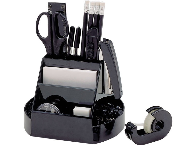 Комплектация: карандаш чернографитный - 4 шт, ручка шариковая - 2 шт, макетный нож - 1 шт, ножницы - 1 шт, линейка пластиковая - 1 шт, кнопки - 1 уп, степлер - 1 шт, антистеплер - 1 шт, точилка пластиковая - 1 шт, ластик - 1 шт, скобы - 1 уп, скрепки - 1 уп, бумага для записей - 1 блок, диспенсер со скотчем - 1 шт