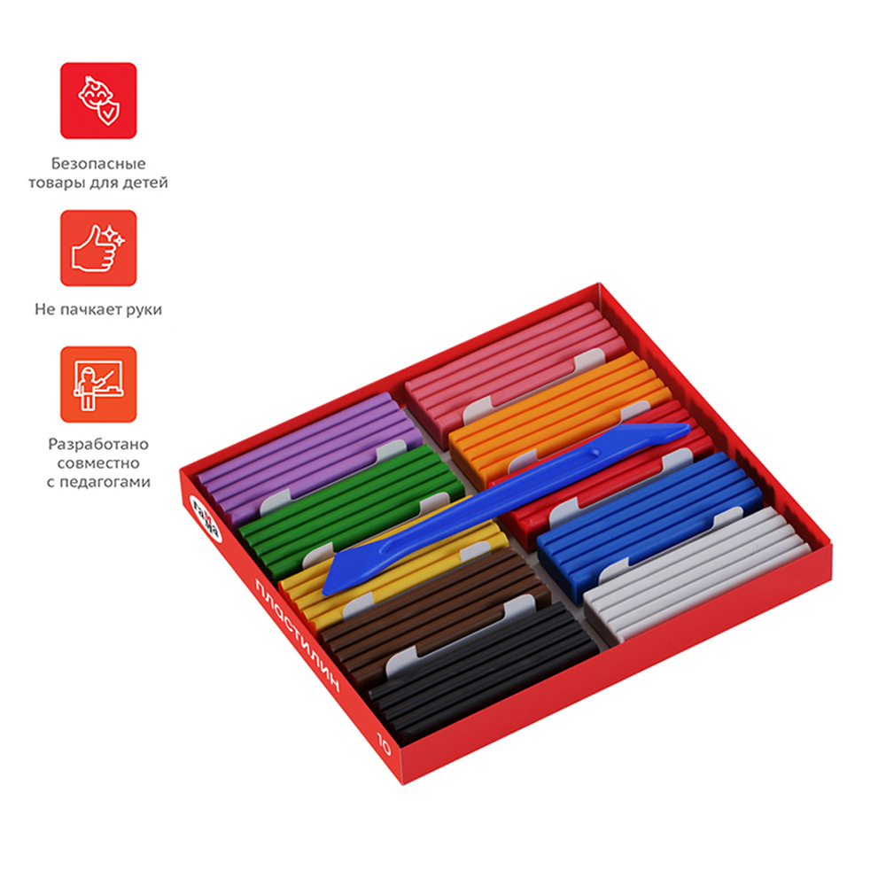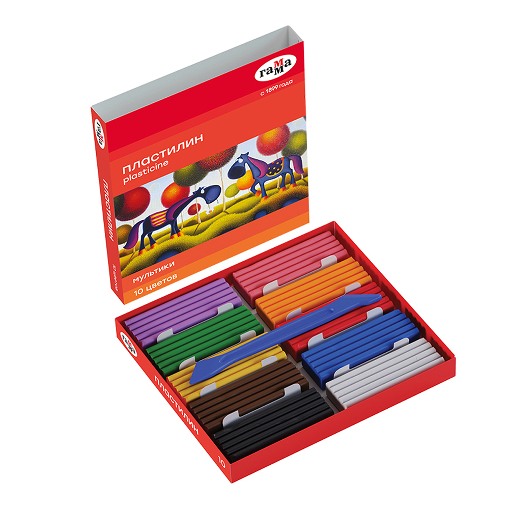 Классический пластилин от торговой марки «Гамма» серии «Мультики» рекомендован педагогами для укрепления мышц кисти и развития мелкой моторики. После разминания обретает однородную структуру и пластичность: хорошо смешивается и размазывается, но не крошится. В наборе 10 цветов. Вес одного бруска — 20 г. Пластиковый стек в комплекте. Пластилин «Мультики» — оптимальный материал для занятий лепкой в школе и детском саду. Прекрасно подходит для техники рисования пластилином — пластилинографии. В составе светостойкие пигменты, поэтому поделки долго хранятся и не выцветают.
