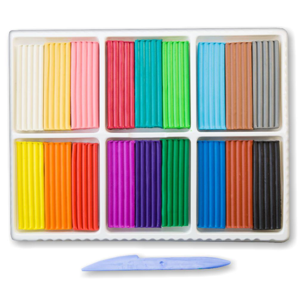 В наборе восемнадцать цветов. В комплектацию входит стек, который помогает в лепке мелких деталей.