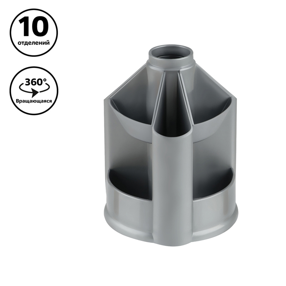 Выполнена из прочного металла в современном сером металлике и оснащена вращающейся конструкцией, которая обеспечивает быстрый доступ к любым принадлежностям на столе. Подставка компактна, не занимает много места, подходит для хранения ручек, карандашей, маркеров и других мелких предметов. Поставляется без наполнения, что позволяет самостоятельно выбрать содержимое.
