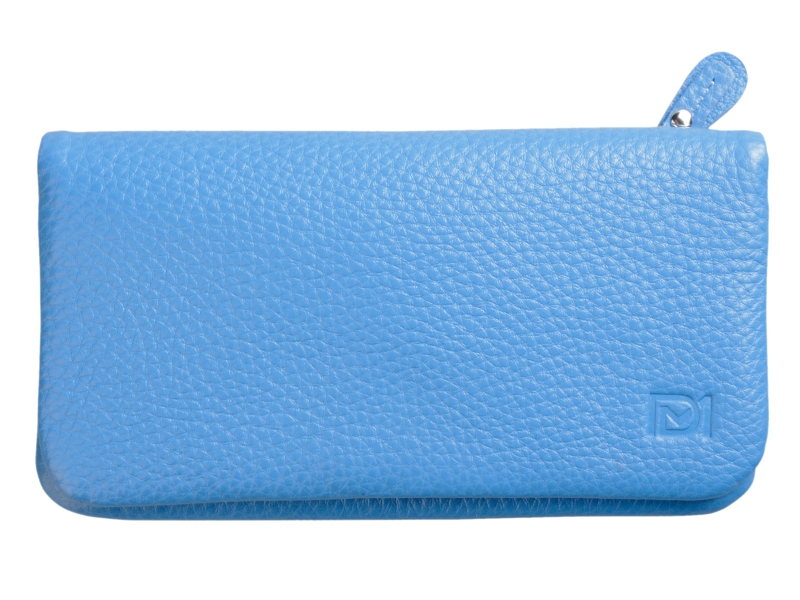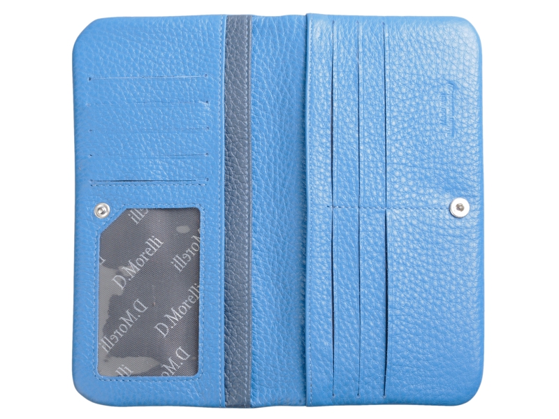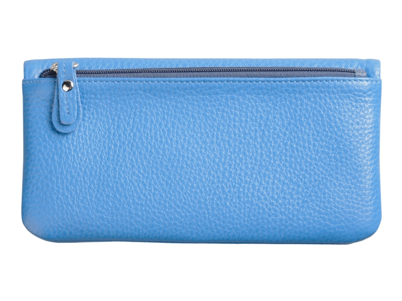 Портмоне женское "Бриенна" изготовлено из натуральной зернистой кожи голубого цвета, закрывается на клапан с кнопкой.  Внутренний функционал: 3 плоских кармана для купюр, 11 карманов для пластиковых карточек, так же имеется на обороте карман на молнии для монеток. Отличный подарок вашим близким и родным. Размер: 18,5х9,7 см.