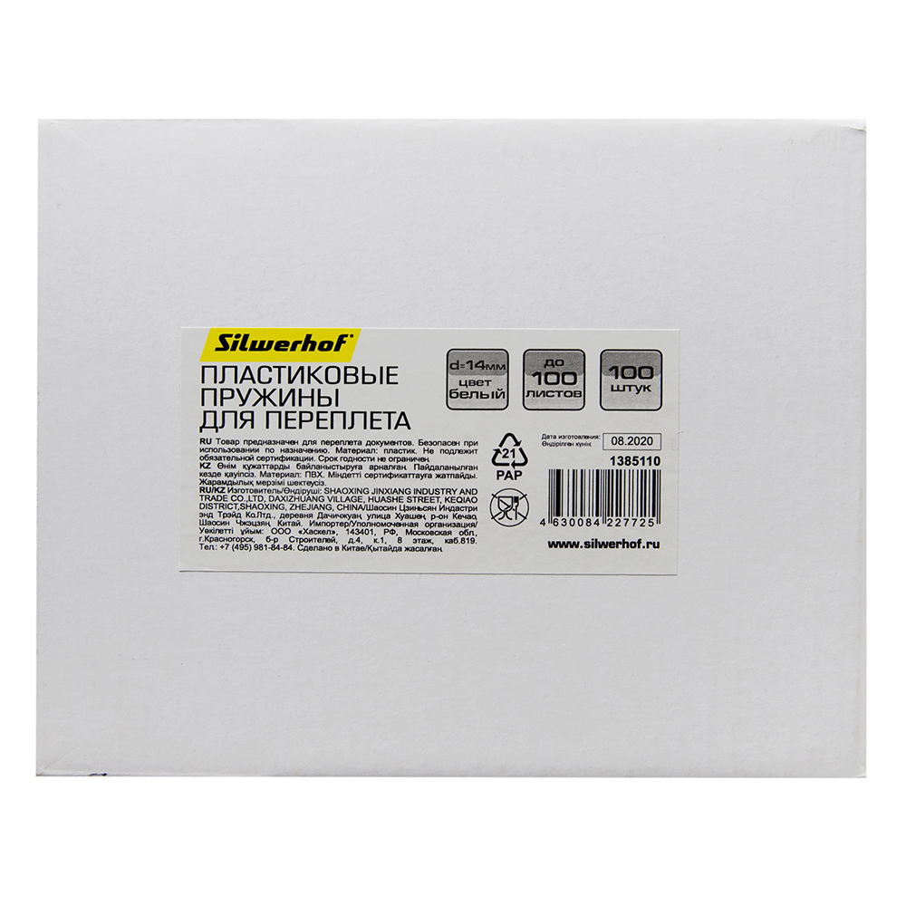 Пружина пластиковая в наборе от бренда "Silwerhof". Диаметр - 14 мм. В наборе 100 шт. Цвет белый. Пружины используются для самостоятельного переплета отчетов, прайсов, каталогов, презентаций и т.д. с целью длительного пользования.