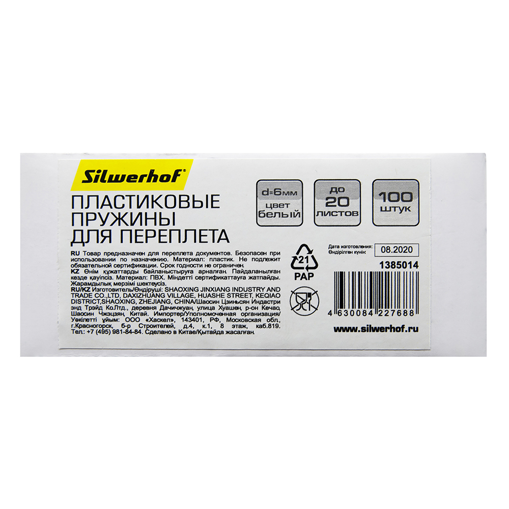 Пружина пластиковая в наборе от бренда "Silwerhof". Диаметр - 6 мм. В наборе 100 шт. Цвет белый. Пружины используются для самостоятельного переплета отчетов, прайсов, каталогов, презентаций и т.д. с целью длительного пользования.