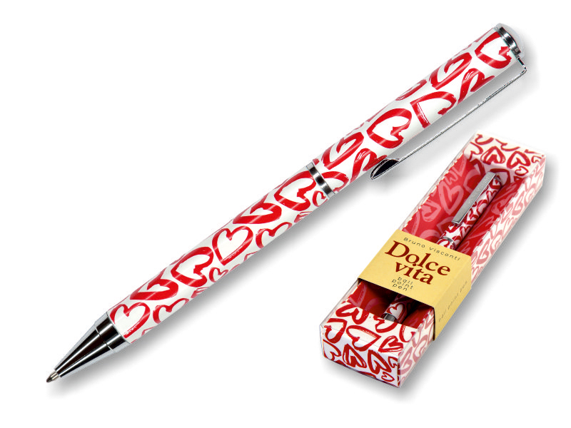 Ручка шариковая автоматическая подарочная  «Dolce Vita.Сердечки. Красное» от торговой марки Bruno Visconti – это элегантное украшение рабочего стола. Яркий дизайн металлического корпуса привлечет к себе внимание и не оставит никого равнодушным. Прочность корпуса и нажимной механизм подачи стержня обеспечивают удобство в эксплуатации и долгий срок службы шариковой автоматической ручки. Синие пигментные чернила DOKUMENTAL (Германия) и пишущий узел Premec (Швейцария) – гарантируют качественное и мягкое письмо.