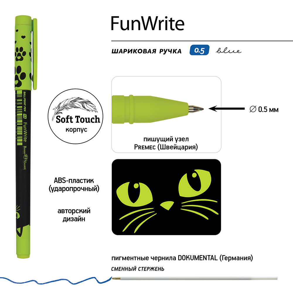 Ручка шариковая - синий стержень 0.5мм. "FunWrite. Черный кот" (Bruno Visconti)