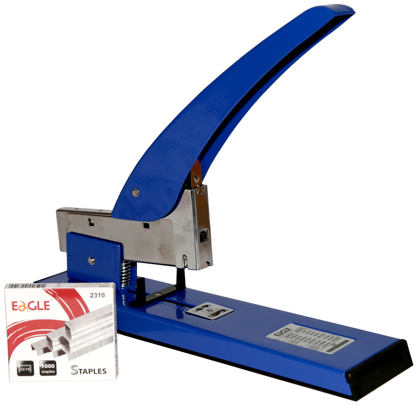 Степлер - необходимый аксессуар в любом офисе. Степлер от китайского бренда EAGLE отличается высокой мощностью - сшивает от двух до двухсот листов. Подойдет для типографий, больших организаций. Корпус и рабочий механизм сделаны их прочного металла, что гарантирует долгий срок службы. Нижняя часть отделана пластиком, который исключает повреждение поверхности стола, при использовании степлера. Изделие массивное, устойчивое. Дизайн гениален своей простотой: прямые линии корпуса, обтекаемая форма ручки. Цветовое оформление синее (черное).