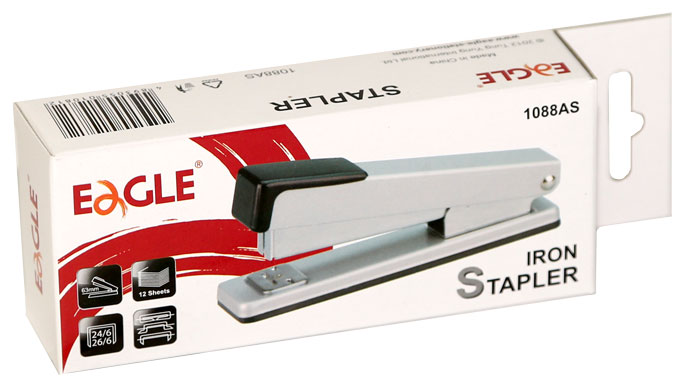 Степлер - необходимый аксессуар в любом офисе. Степлер от китайского бренда EAGLE имеет эргономичный дизайн, что обеспечивает комфортное использование. Корпус и рабочий механизм сделаны из прочного, высококачественного металла, что гарантирует долгий срок службы. Дизайн лаконичный и интересный одновременно: серая цветовая гамма, верх корпуса декорирован пластиковой вставкой синего цвета. Вставка обеспечивает удобство при использовании - помогает надежно фиксировать аксессуар в руке. Изделие обладает способностью к сшиванию двенадцати листов. Идеально подходят скобы двух размеров №24/6 и №26/6.