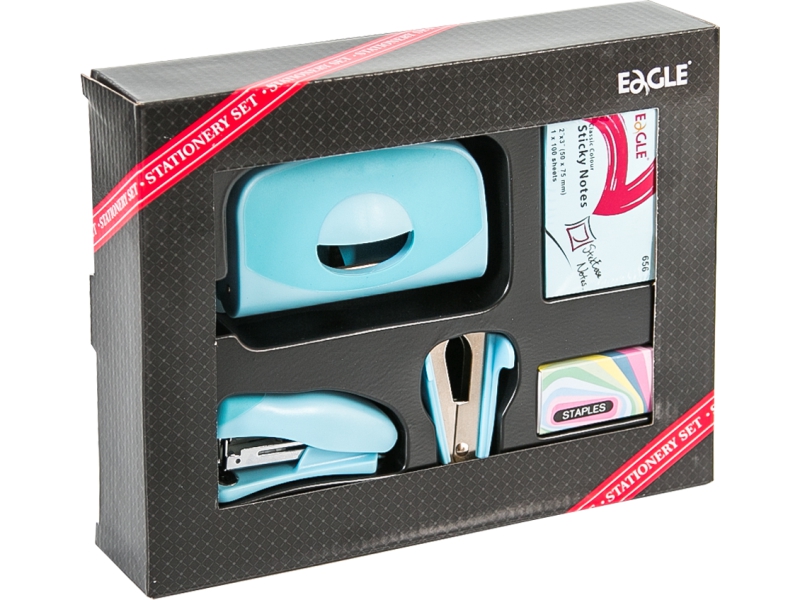 Степлер-набор (степлер №10 +скобы + дырокол+ антистеплер + бумага д/заметок с клеевым краем) бирюзовый в подарочной коробке (EAGLE)