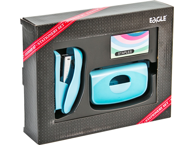 Степлер-набор (степлер №24/6 26/6 +скобы + дырокол) бирюзовый в подарочной коробке (EAGLE)