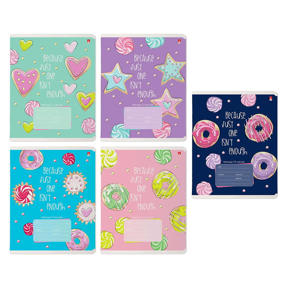 Тетрадь А5, 12 листов для 1 класса с косой линией «Сладкое настроение» (Альт) — удобная и яркая тетрадь для младших школьников, предназначенная для обучения письму и формирования правильного написания букв.