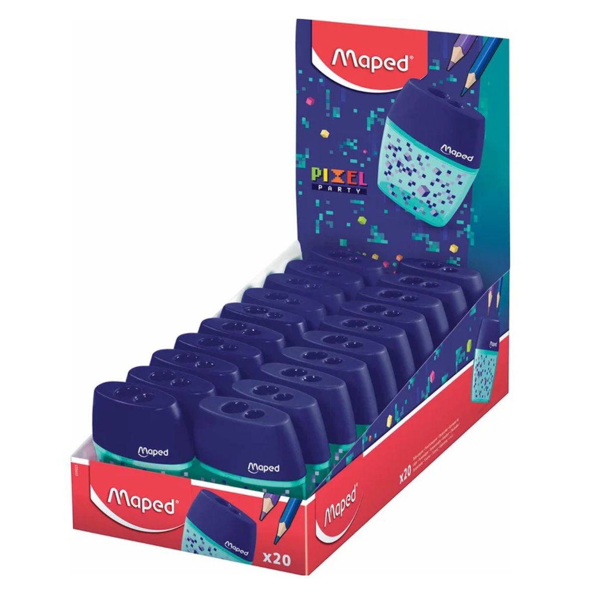 Точилка 2 отверстия «PIXEL PARTY SHAKER» с контейнером (Maped). Яркая и функциональная точилка PIXEL PARTY SHAKER от Maped станет стильным аксессуаром в школьном пенале. Оснащена двумя отверстиями для карандашей разного диаметра и вместительным контейнером для сбора стружки, что помогает поддерживать порядок на рабочем месте.